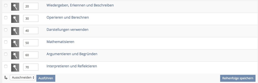 Nach dem Import sehen Sie den Ordner „mathematische Handlungsaspekte“ in Ihrem Kompetenzmanagement. Dieser enthält folgende sechs Kompetenzen: