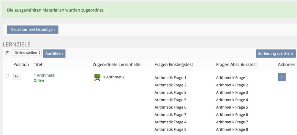 Klicken Sie für das erste Lernziel – hier 1 Arithmetik – auf das Aktionen-Dropdown und wählen Lerninhalte zuordnen.
