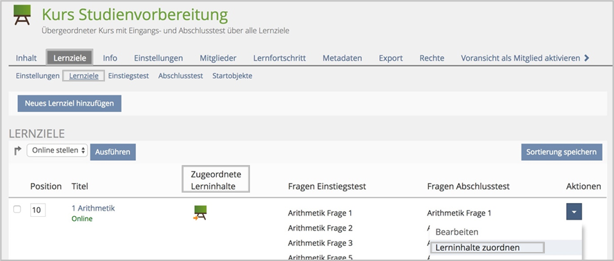 Klicken Sie für das erste Lernziel – hier 1 Arithmetik – auf das Aktionen-Dropdown und wählen Lerninhalte zuordnen.