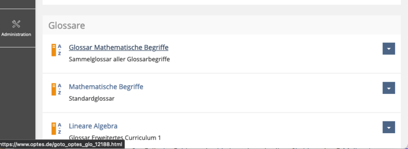 2. Bewegen Sie den Mauszeiger auf den Titel des Glossars ohne diesen anzuklicken (Hover). An der unteren Seite Ihres Browserfensters erscheint der Link zum Glossar.