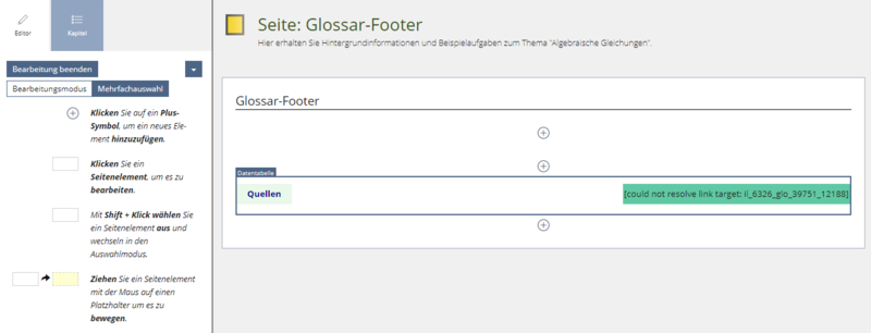 1. ILIAS zeigt Ihnen jetzt den Inhalt der Tabelle. In der linken Spalte befindet sich der Link zur Seite Quellen. Die mittlere Spalte ist leer. Und in der rechten Spalte sehen Sie den Link zum Glossar, der korrigiert werden muss.