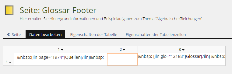 ILIAS zeigt Ihnen jetzt den Inhalt der Tabelle. In der linken Spalte befindet sich der Link zur Seite Quellen. Die mittlere Spalte ist leer. Und in der rechten Spalte sehen Sie den Link zum Glossar, der korrigiert werden muss.