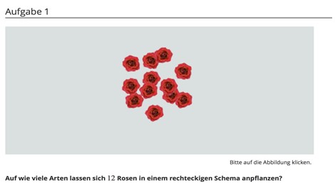 Gehen Sie bitte nun im 1. Kurs Arithmetik im Lernmodul Rechnen mit ganzen Zahlen in das Kapitel 2.2 Aufgaben mit Lösungen in die Aufgabe 1. Vergewissern Sie sich, dass die Animation mit den Rosen angezeigt wird und sich die Anordnung der Rosen nach Draufklicken auf die Animation ändert.