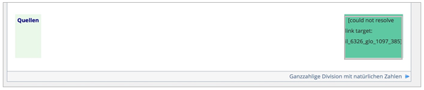 Auf allen Lernmodulseiten wird in der Fußleiste ein Link zum Glossar als Navigationshilfe angeboten. Der Link führt nicht zu einem bestimmten Glossarbegriff wie bei den Seiteninhalten, sondern erlaubt den schnellen Zugriff auf das gesamte Glossar Mathematische Begriffe. Beim Import der Kurse kann dieser Link zum Glossar nicht automatisch korrekt gesetzt werden. Er muss daher in jedem Lernmodul neu gesetzt werden.