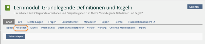 Gehen Sie nun in den ersten Kurs, z.B. Kurs 0 Mathematische Grundlagen, wechseln in den Unterreiter Inhalt » Verwalten und wählen beim ersten Lernmodul im rechten Aktionen-Dropdown die Option Inhalt bearbeiten. Sie befinden sich jetzt in der Bearbeitungsansicht des Lernmoduls.
