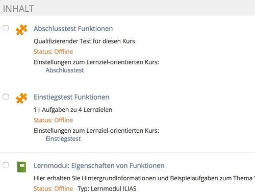 Überprüfen Sie, ob Sie den Kurs und seine Inhalte bereits online geschaltet haben. Die Kurse als solche können Sie über Einstellungen im Bereich „Verfügbarkeit“ online schalten. Aber auch einzelne Materialien innerhalb eines Kurses könnten noch offline sein. Über den Menüpunkt Inhalt » Verwalten sehen Sie direkt auf einen Blick, ob ein Material offline ist (Status: Offline wird in orangener Schrift eingeblendet):