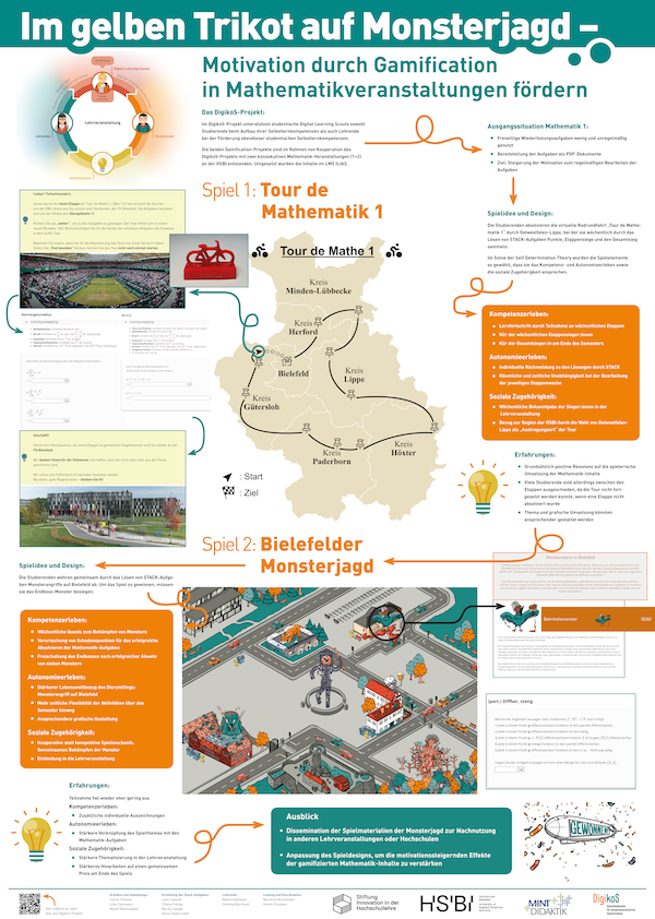 Auch auf dem MINT-Symposium, das vom 21.09.2023 bis zum 22.09.2023 an der TH Nürnberg stattfand, waren Henrik Pruisken und Nils Arne Brockmann vertreten. Im Rahmen einer Poster-Session präsentierten sie die beiden Gamification-Projekte „Tour de Mathematik 1“ und „Bielefelder Monsterjagd“. Wie die Spielinhalte erfolgte die Gestaltung des Posters gemeinsam mit zwei studentischen Mitarbeiterinnen des DigikoS-Projekts.