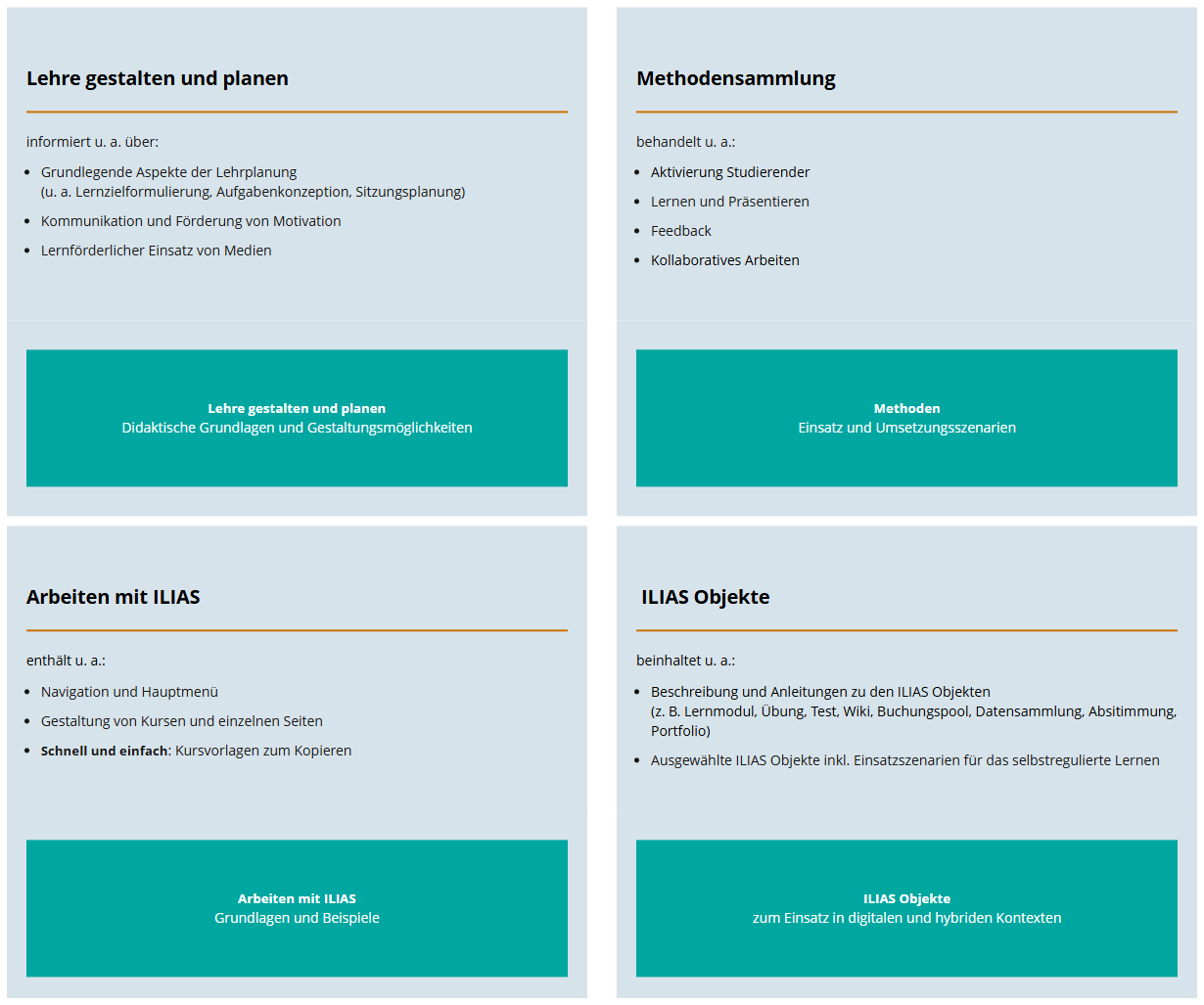 Für Lehrende gibt es die sogenannte "Toolbox". Sie unterstützt bei der Gestaltung von digitalen Lehr-Lern-Szenarien. Die Toolbox unterteilt sich in die Bereiche didaktische Grundlagen und Methoden sowie Arbeiten mit dem LMS ILIAS und dessen Werkzeuge. Die Inhalte können sowohl einzeln genutzt werden als auch als verknüpftes Gesamtpaket, bestehend aus einem didaktischen Inhalt mit passendem Methoden-Vorschlag und Erläuterung der Lernplattform.